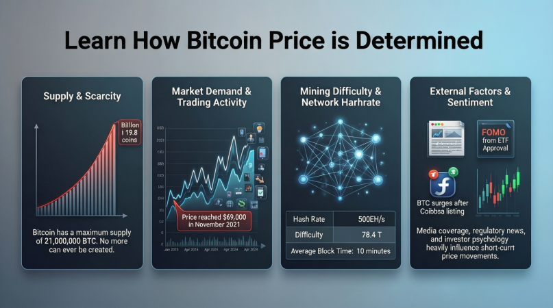 Bitcoin’s price is influenced by supply and demand, trading volume, investor sentiment, and global events. Key factors include: